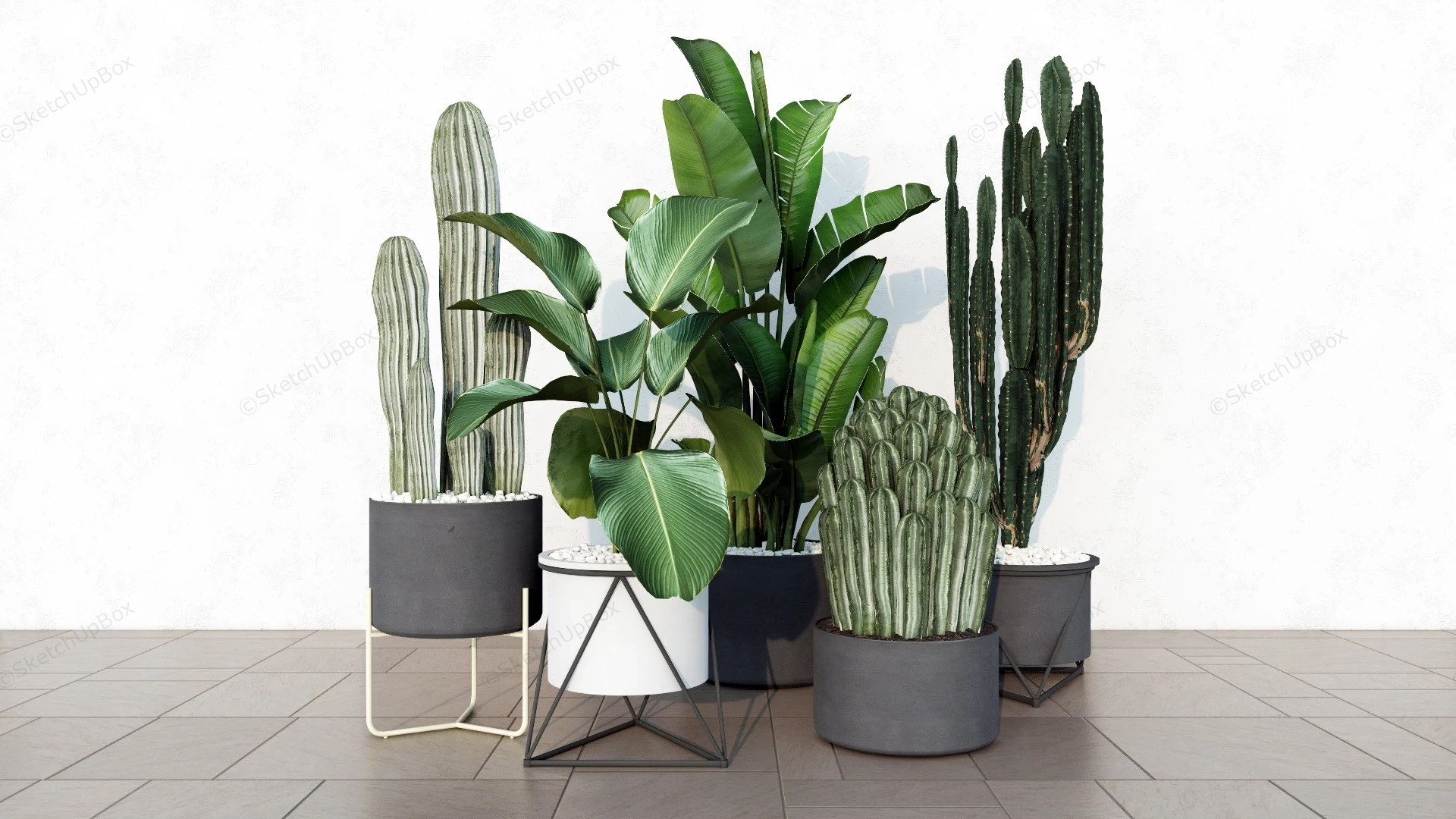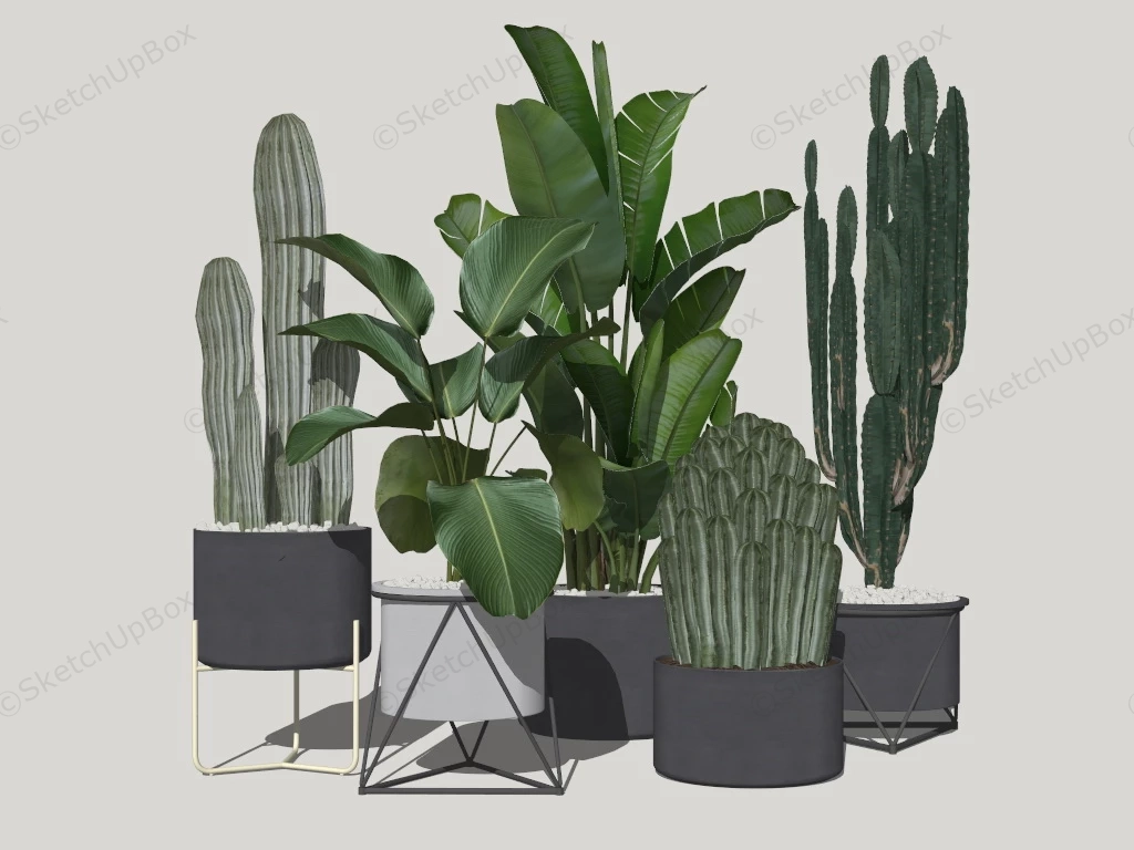 Indoor large planter with stand potted cactus and foliage plant sketchup 3d model.