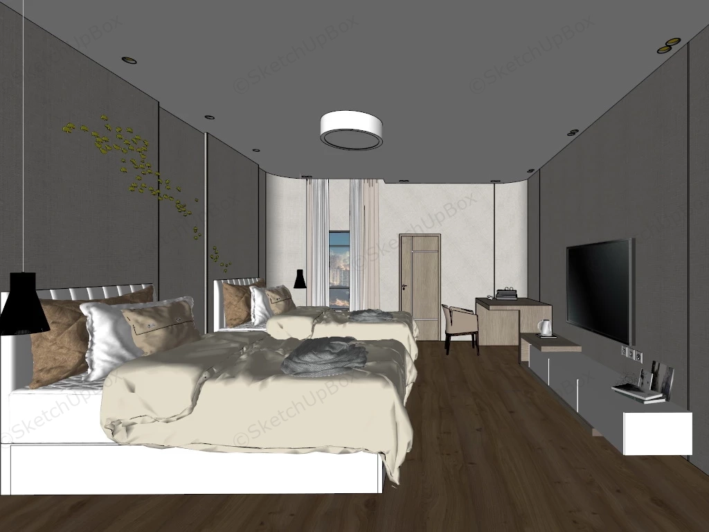 Twin Bed Hotel Room Hotel & Restaurant 1.56kTwin bed hotel room interior design sketchup 3d model.DownloadEdges:701572Faces:362902File Version:SketchUp 8.skp File Size:64 MBTag Count:4Materials:117Render:NoneHotel Room