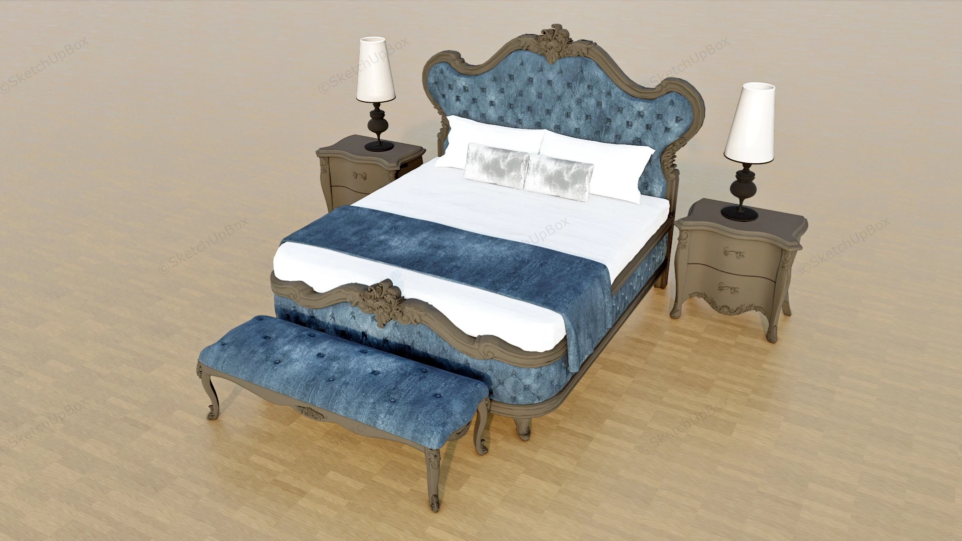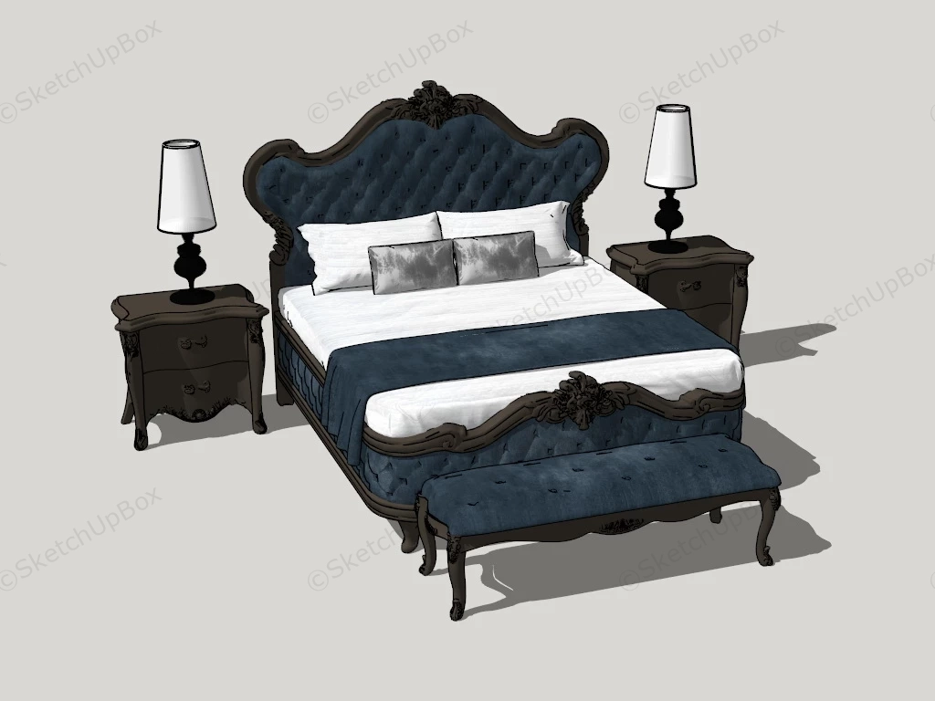 Beautiful French country bedroom furniture sketchup 3d model, blue nubuck bed and bed bench, black nightstands.