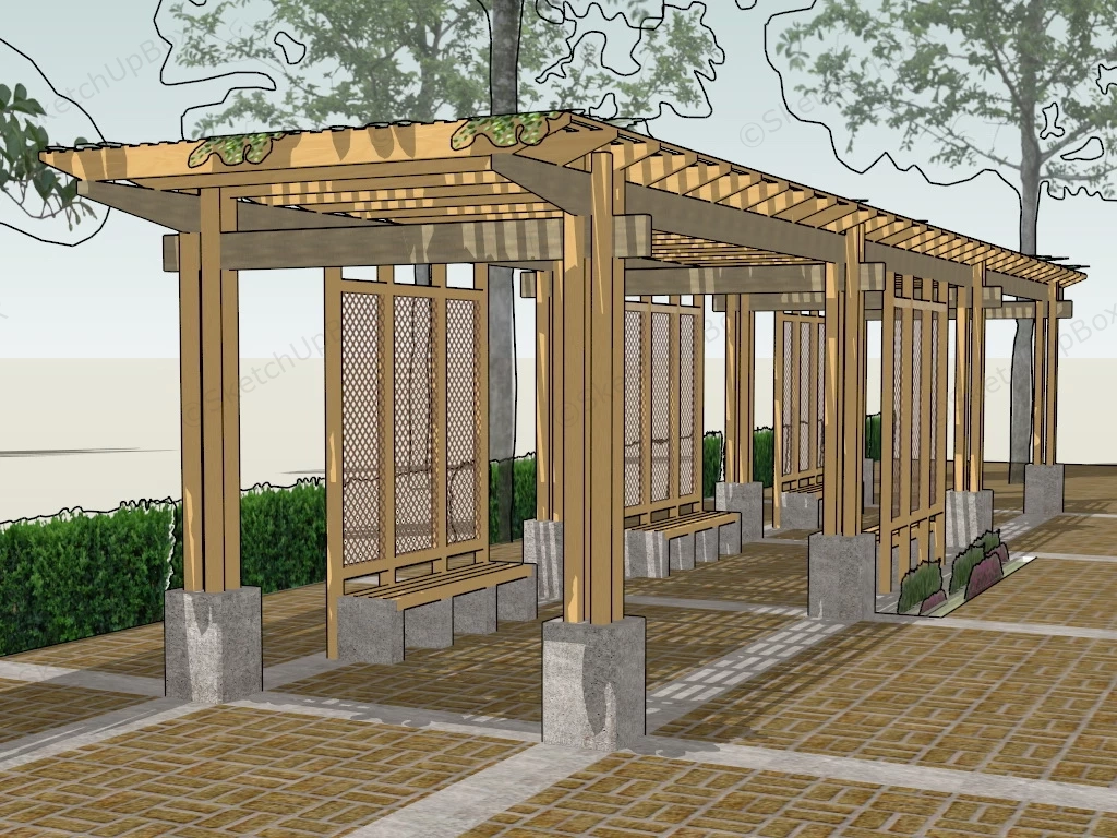 Pergola With Bench Seats Architectural Elements 1.56kWood pergola with bench seats sketchup 3d model.DownloadEdges:27602Faces:4849File Version:SketchUp 8.skp File Size:21.7 MBTag Count:1Materials:14Render:NonePergolas